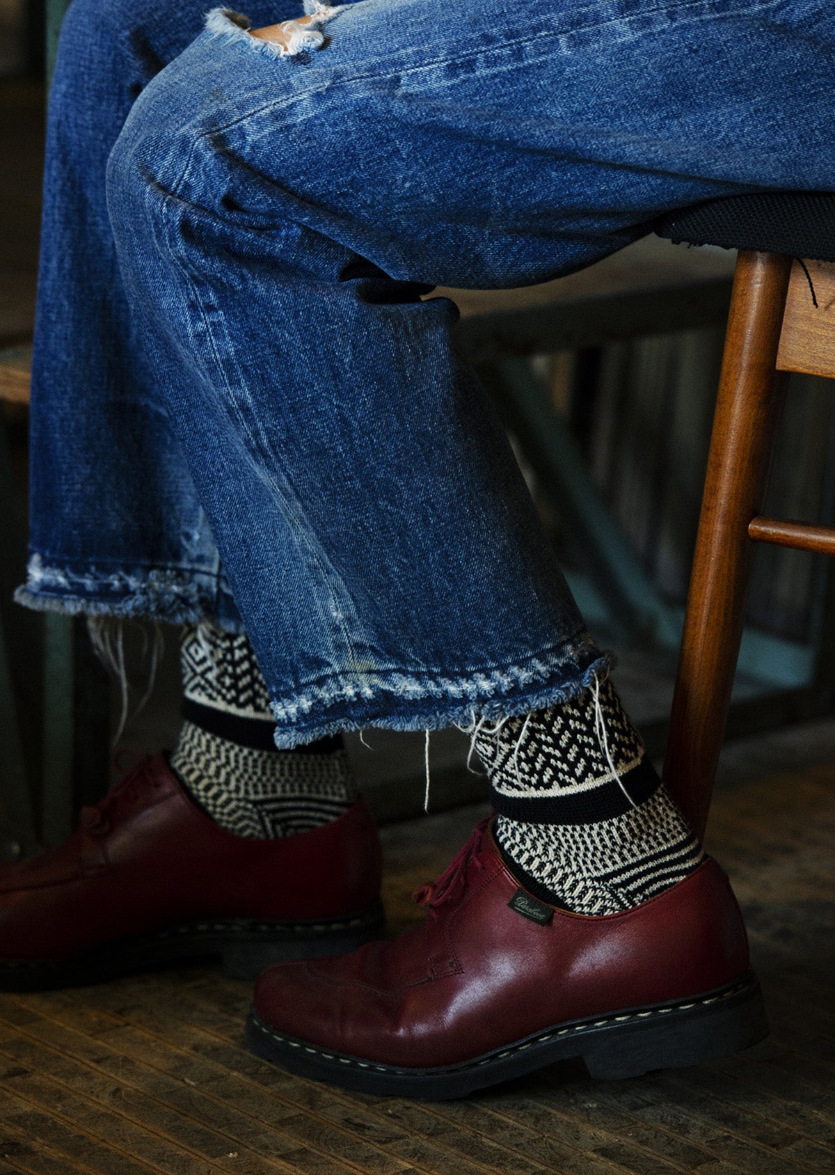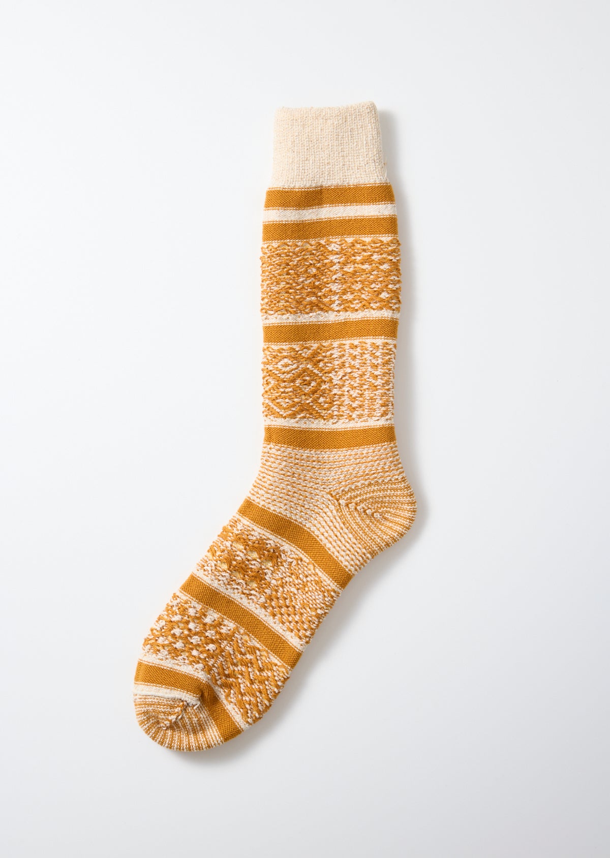 By mix and matching a series of the brand’s exclusive patterns, these socks overcome the major fault of jacquard socks, lack of horizontal stretch. Although most patterned socks have many loose yarns on the reverse side, ROTOTO’s jacquard socks are carefully knitted not to leave loose yarns for better comfort. Extraordinary skills and creative enthusiasm of sock craftsmen makes this item look beautiful even on the back side.