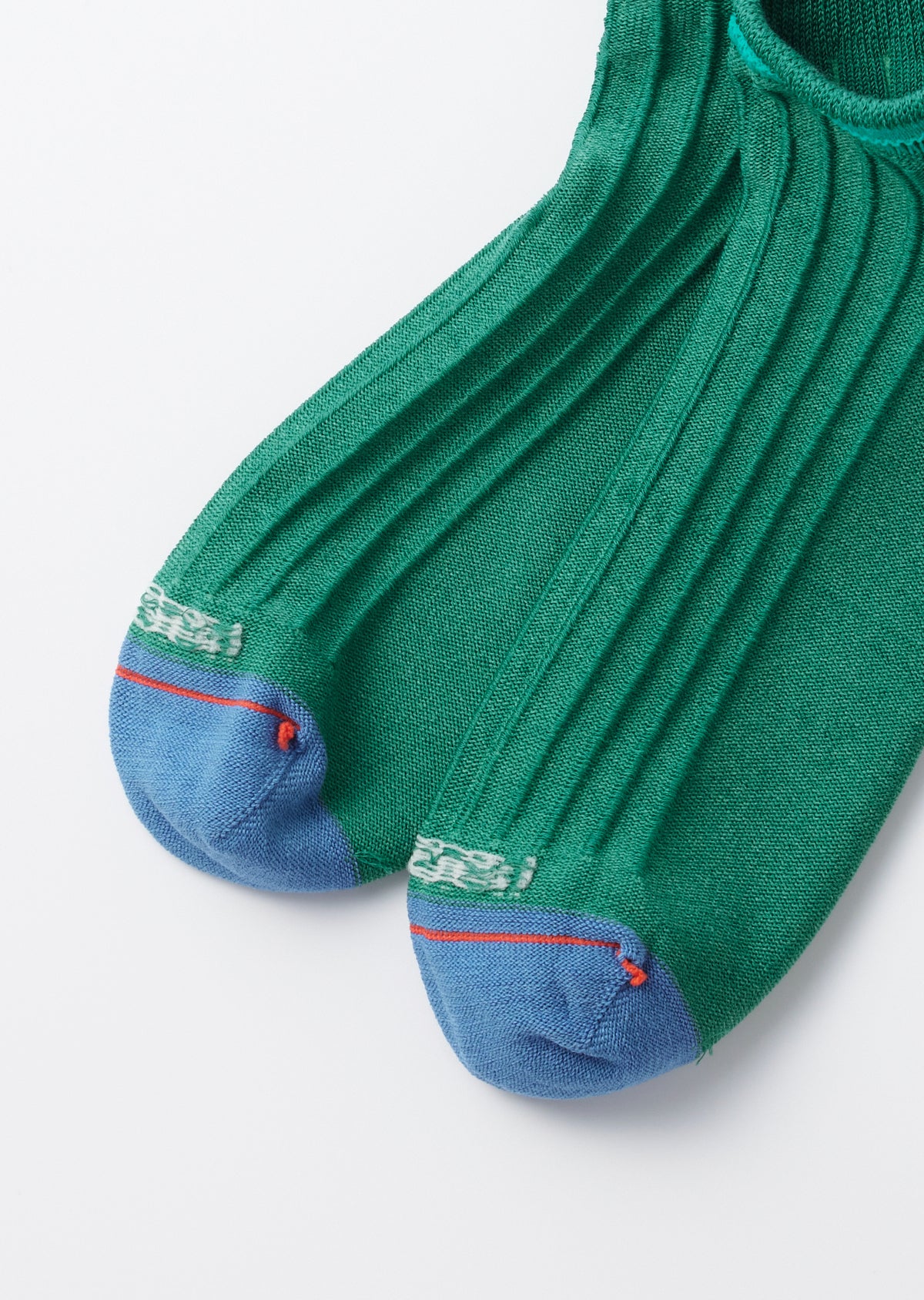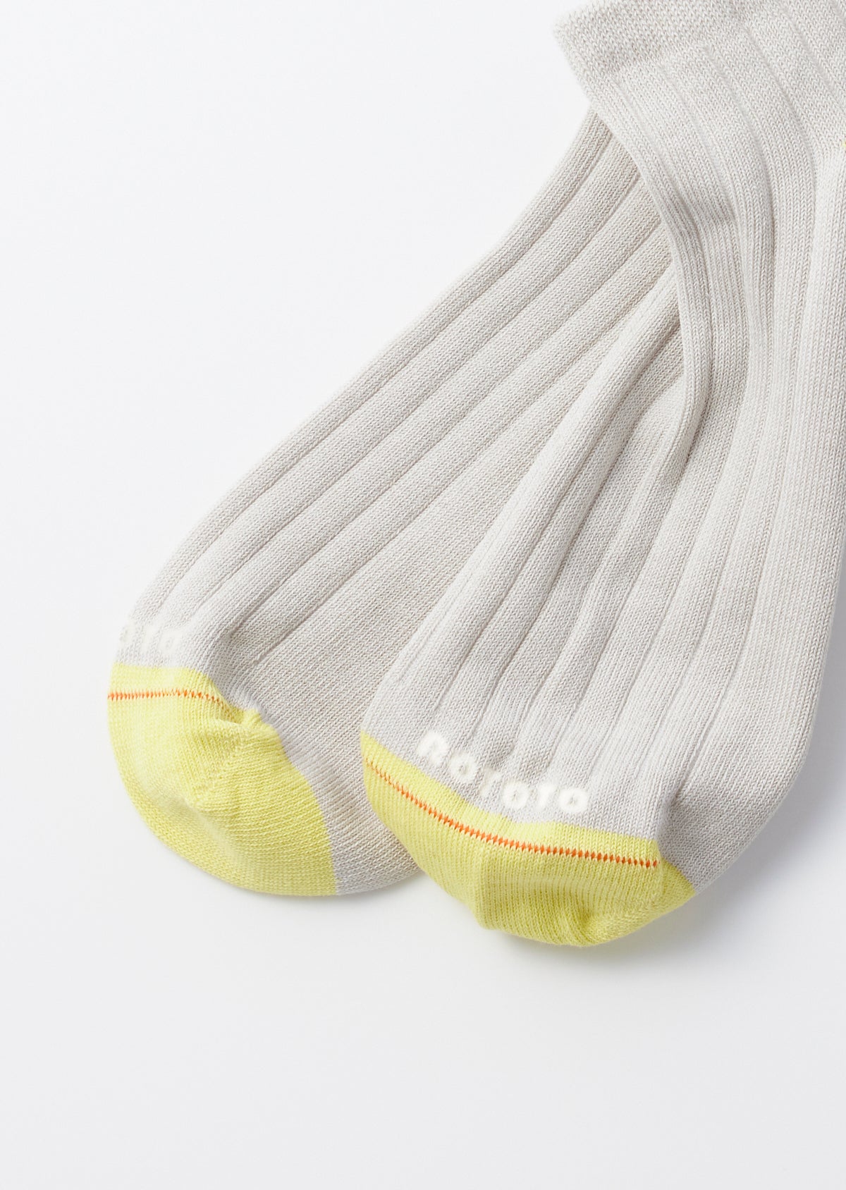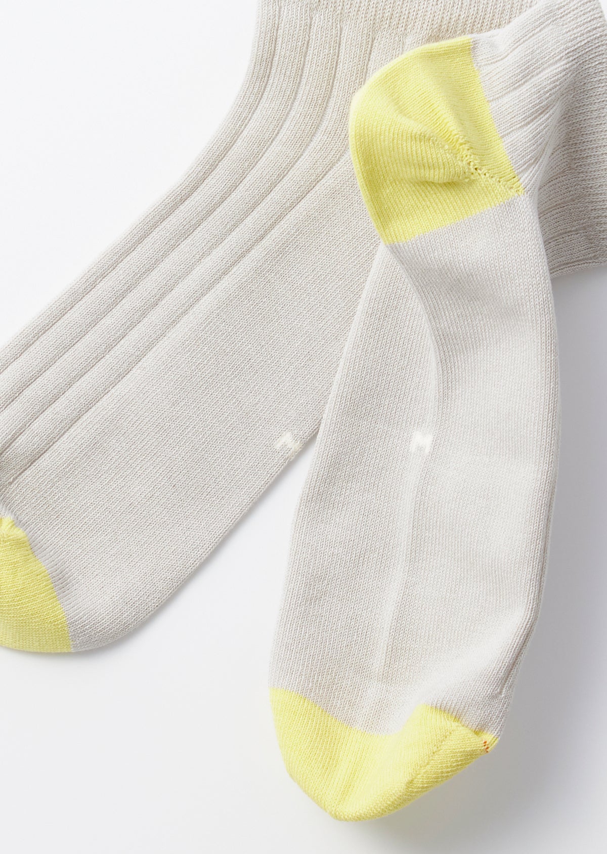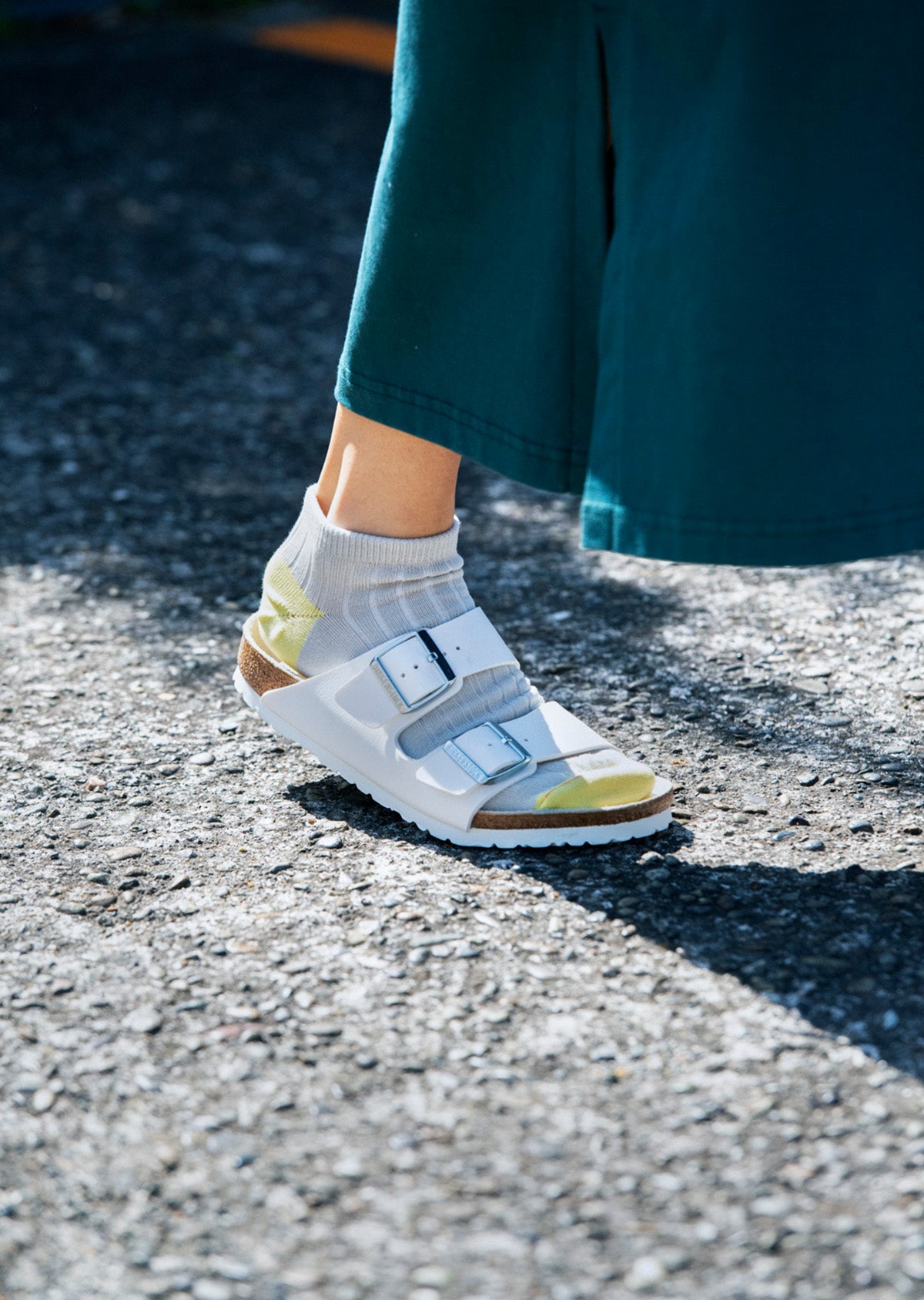 スポーツソックスを専門に生産している工場で編み立てたこちらのソックスは、デイリーにスニーカーやサンダルと合わせていただくことはもちろん、ちょっとしたアウトドアレジャーやウォーキング、ジョギングなどのカジュアルなスポーツシーンでも使える汎用性の高いアンクルソックスです。素材には、オーガニックコットンとリサイクルポリエステルを特殊な製法で撚り合わせた糸を使用。コットンの肌あたりの良さと、ポリエステルの速乾性、耐久性を兼ね備えた、サラリとドライなタッチが魅力です。立体的に編み立てたかかと部分がソックスのズレを防ぐほか、つま先の縫製部分を縫い代のごろつきがない「リンキング」始末にすることで、肌あたりの良いフラットな履き心地に仕上げました。