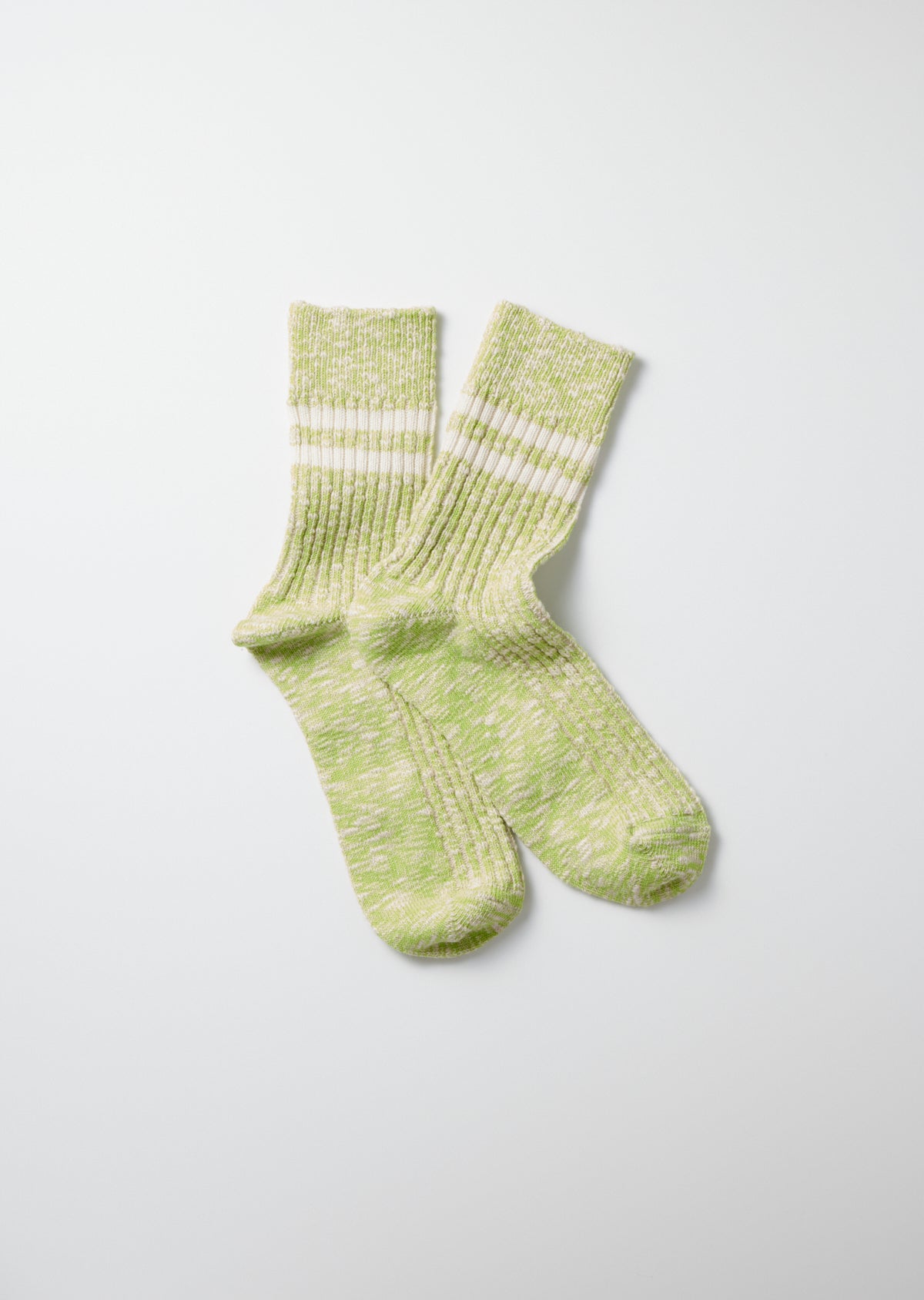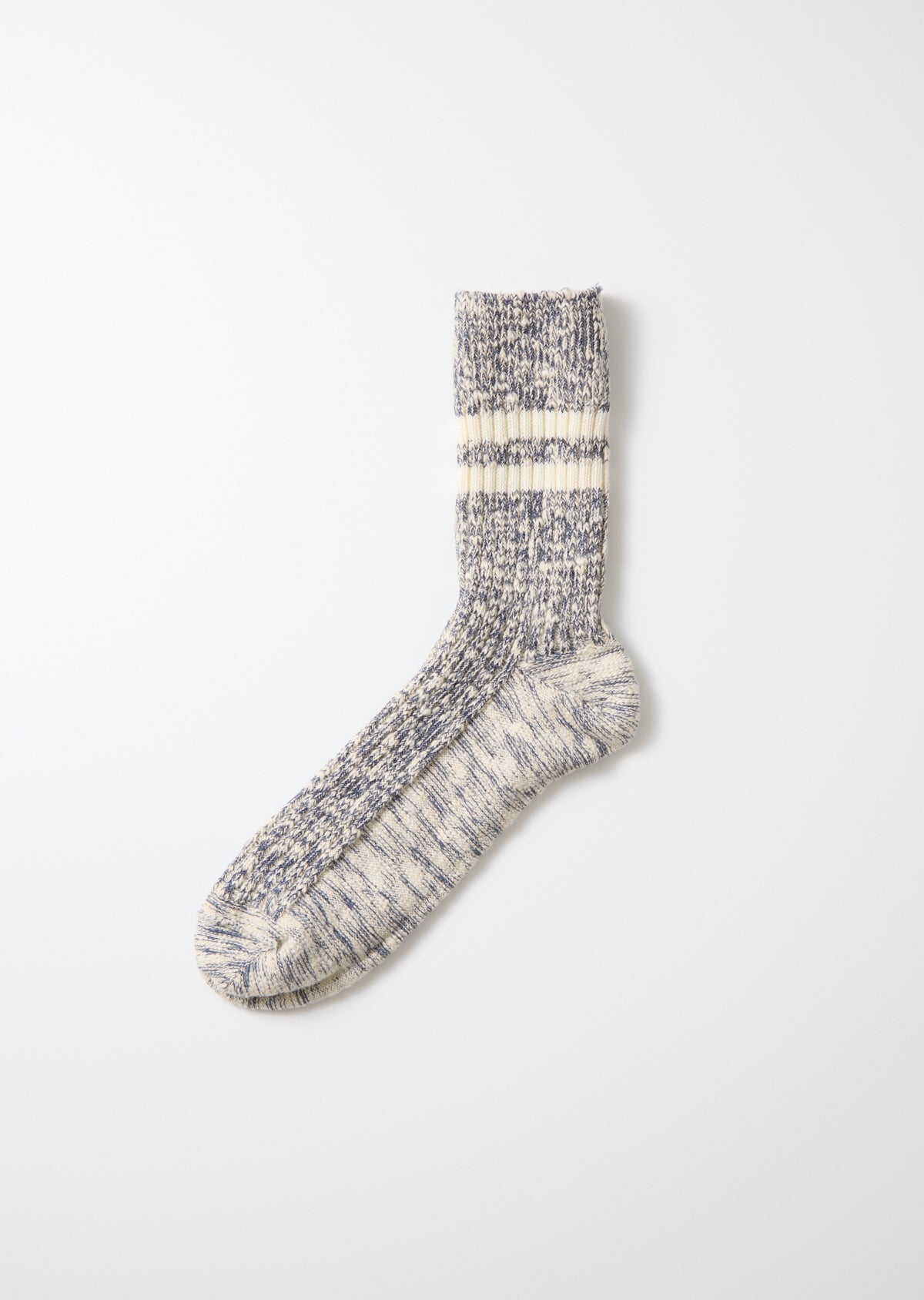 2本のストライプが特徴的なスラブソックスが新品番で登場。2種類の糸をミックスしメランジ調に編み立てることで、着用を繰り返しても汚れや毛玉が目立ちにくいという実用性と、飽きのこないルックスを兼ね備えたスラブ生地は「ソックスといえばコレ!」という方も多いはず。今回、新たに〈ROTOTO〉のスタンダードアイテムとして提案していきたいアイテムが誕生しました。糸は地球環境に配慮したオーガニックコットンのスラブ糸と、リサイクルポリエステル糸を採用。ミックスして編み立てることでオーガニックコットンの肌あたりの良さにポリエステルの耐久性や速乾性を兼ね備えた生地に仕上げました。