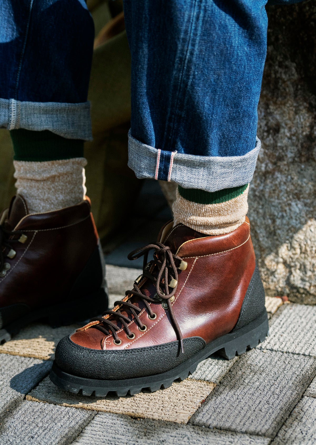 希少な特殊編み機を使用し、熟練の職人の手で丁寧に編み立てたダブルフェイス仕様のソックスは、表側の色糸にコットン、内側には未染色のシルクをふんだんに使用。また、内側のシルクをパイル状に編み立てることで、吸湿性・放湿性といった素材本来が持つ機能を引き出し、しなやかな履き心地を実現しました。