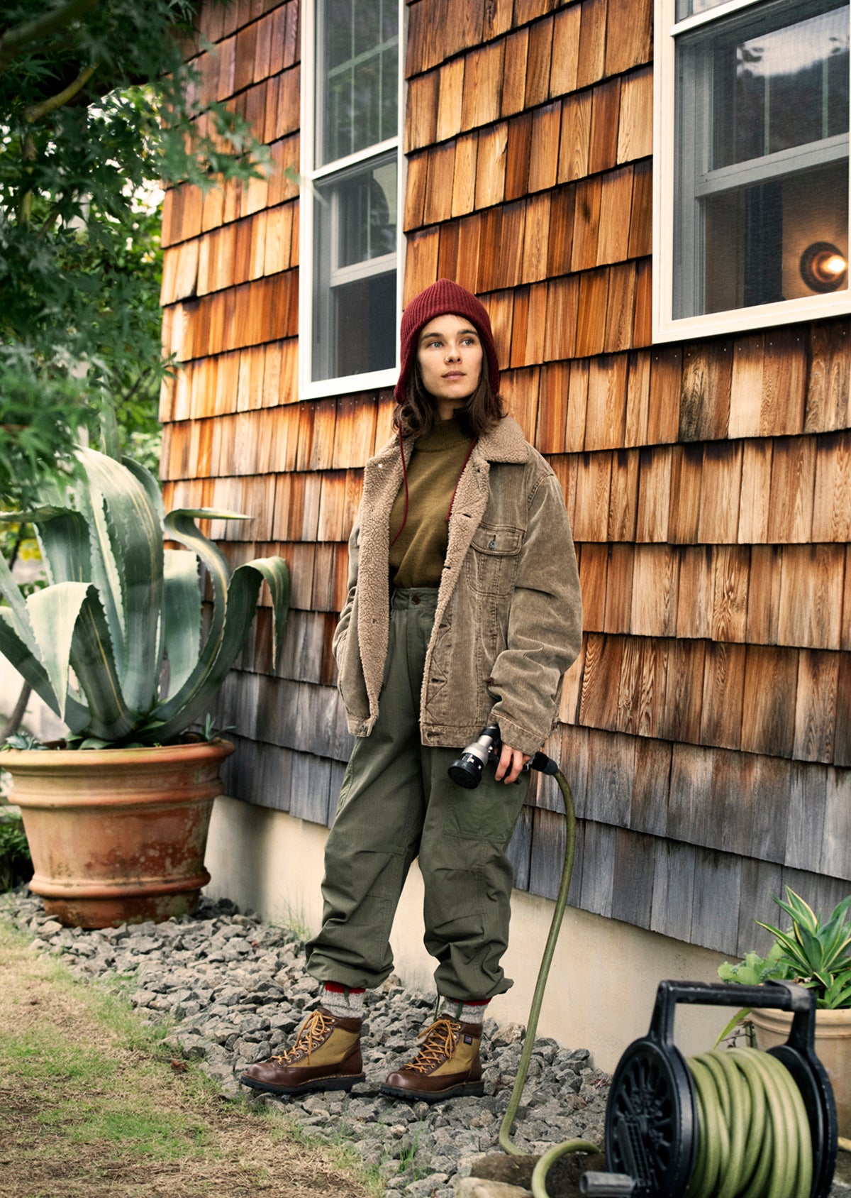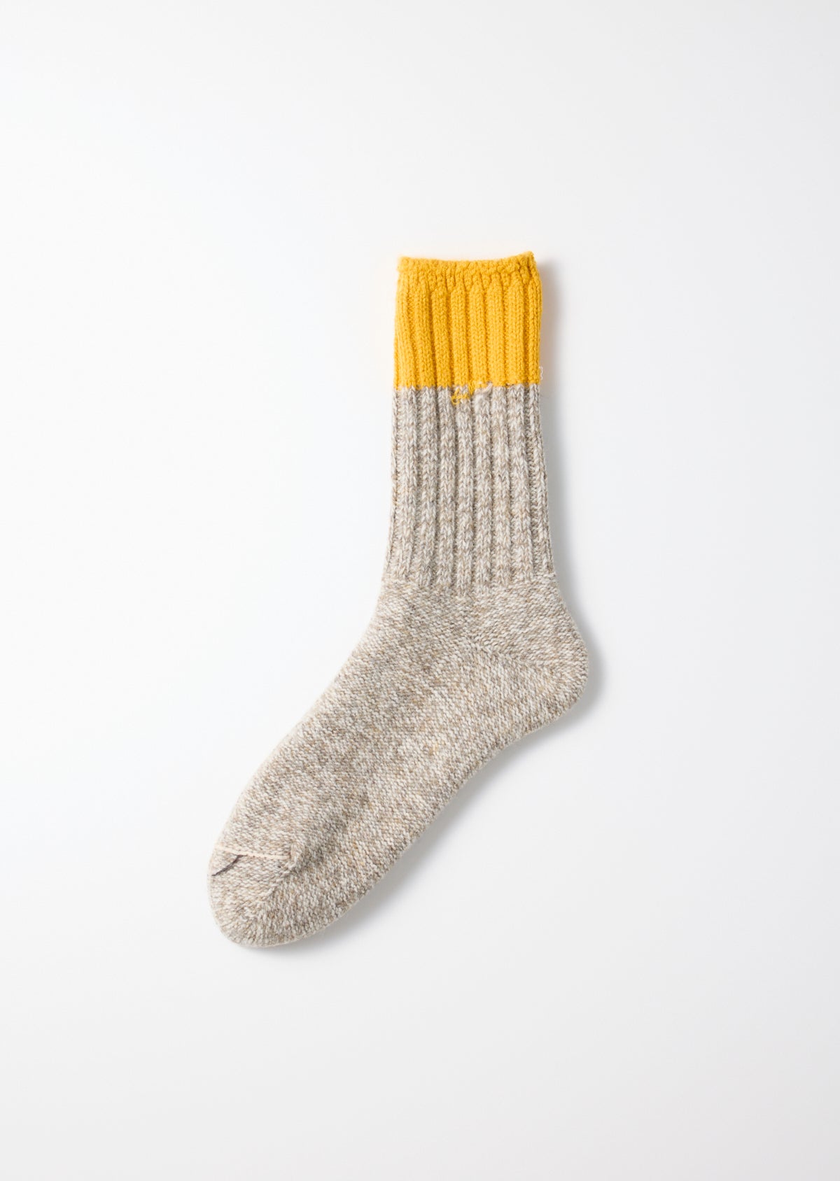 レトロなアウトドアテイストにアクセントカラーの切り替えが目を引く、メリノウール・ローゲージソックス。異なる色合いのメリノウールの双糸(2本の糸を撚り合わせた糸)をさらに撚り合わせて太番手の撚り杢糸を作り、ローゲージ編み機でざっくりと編み立てることで、ボリュームのある生地に仕上げました。