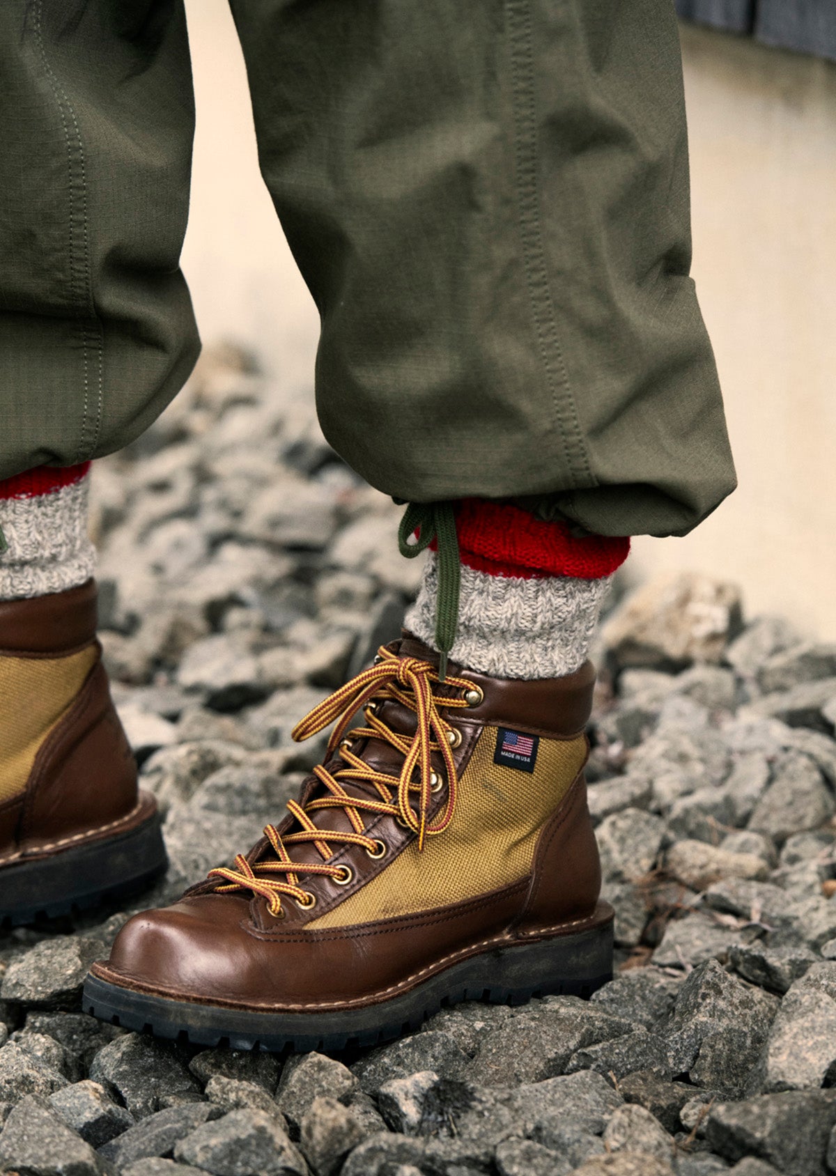 レトロなアウトドアテイストにアクセントカラーの切り替えが目を引く、メリノウール・ローゲージソックス。異なる色合いのメリノウールの双糸(2本の糸を撚り合わせた糸)をさらに撚り合わせて太番手の撚り杢糸を作り、ローゲージ編み機でざっくりと編み立てることで、ボリュームのある生地に仕上げました。