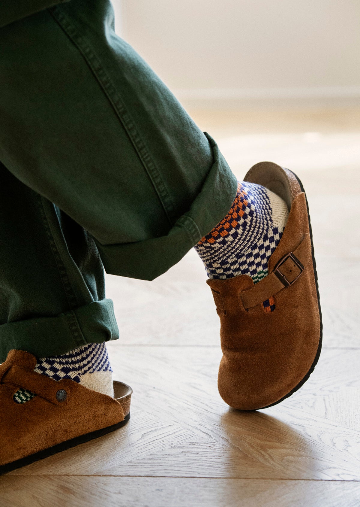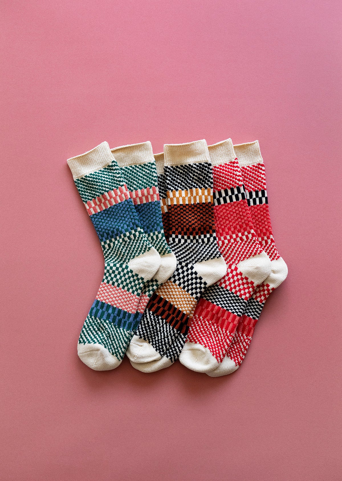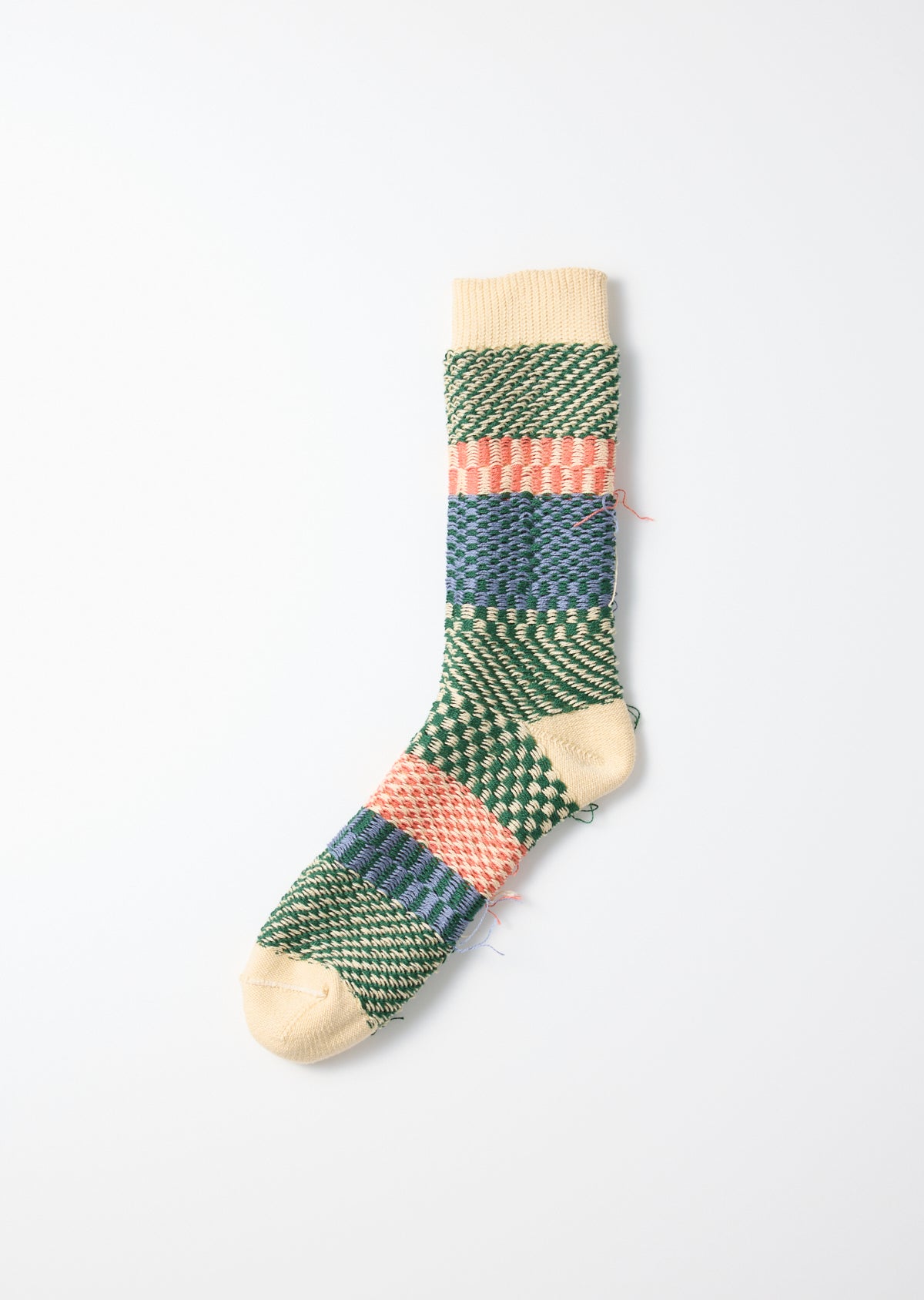 A combination of plaids and ladder-like patterns gives a vibrant vibe to these Jacquard socks. The design is inspired by the mid-century styles, while the colors are modeled after the ones of works of the day that faded over time.