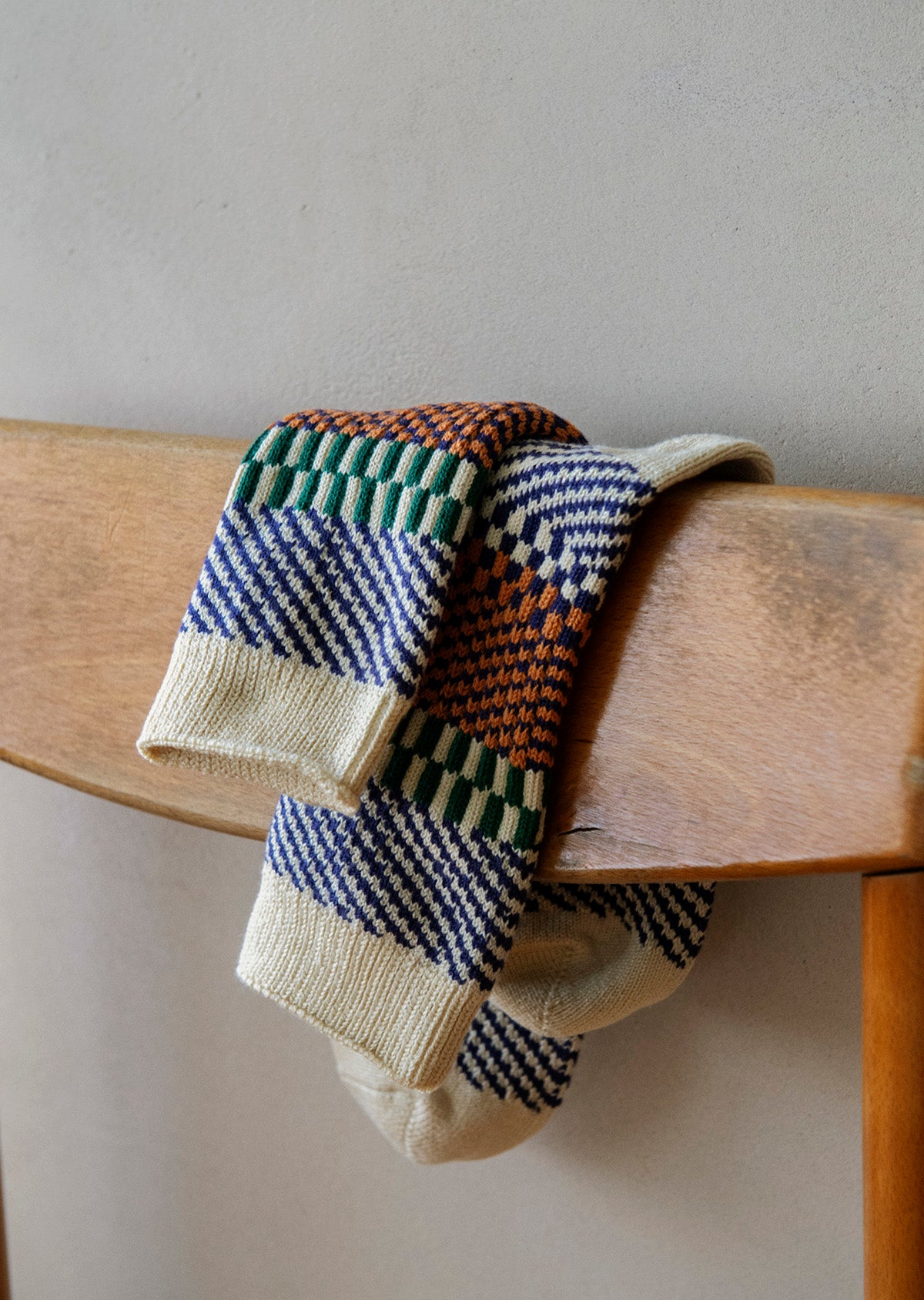 ミッドセンチュリーデザインからインスパイアされた、チェック柄と階段のような段柄の組み合わせがポップなジャカード編みのソックス。当時の作品が経年変化で色褪せたイメージで、カラーをセレクトしました。