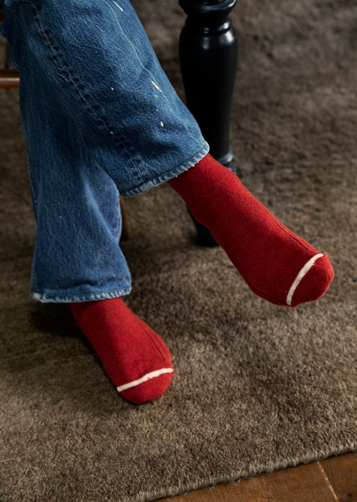 弾力のあるオーストラリア産メリノ種のラムウールを使用したソックス。ミリタリーセーターのディティールを参考にしたデザインは、シンプルながらサイドのリブ編みがアクセントに。しっかりとした度詰めのウール生地に仕上げることで、保温性と耐久性が向上しました。スタイルを問わず着用いただきたいアイテムです。