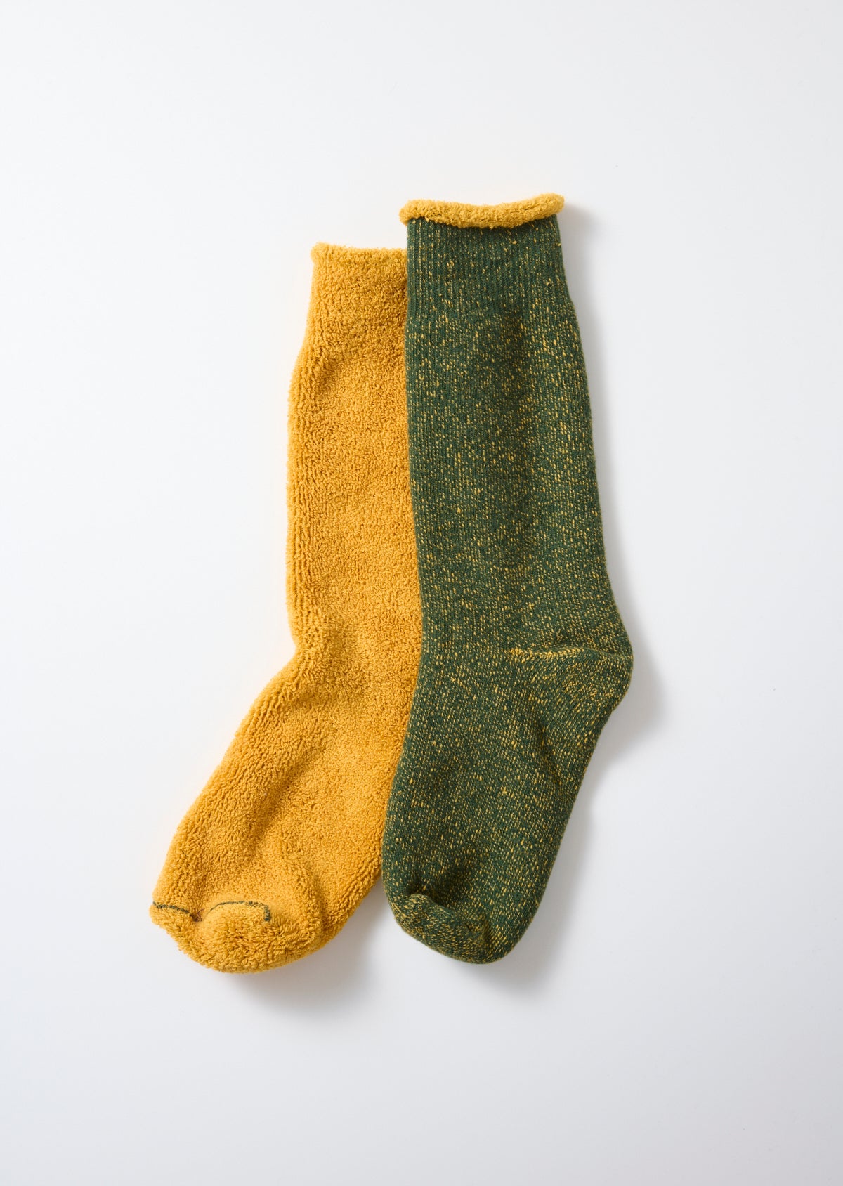 As the name suggests, these pile socks are fully reversible and can be worn inside out. The design is inspired by reversible college T-shirts from the 1970s. Knitted on the same machine used for our “R1001 DOUBLE FACE CREW SOCKS,” each pair features contrasting cotton yarns on the inside and outside for a distinctive two-tone look.