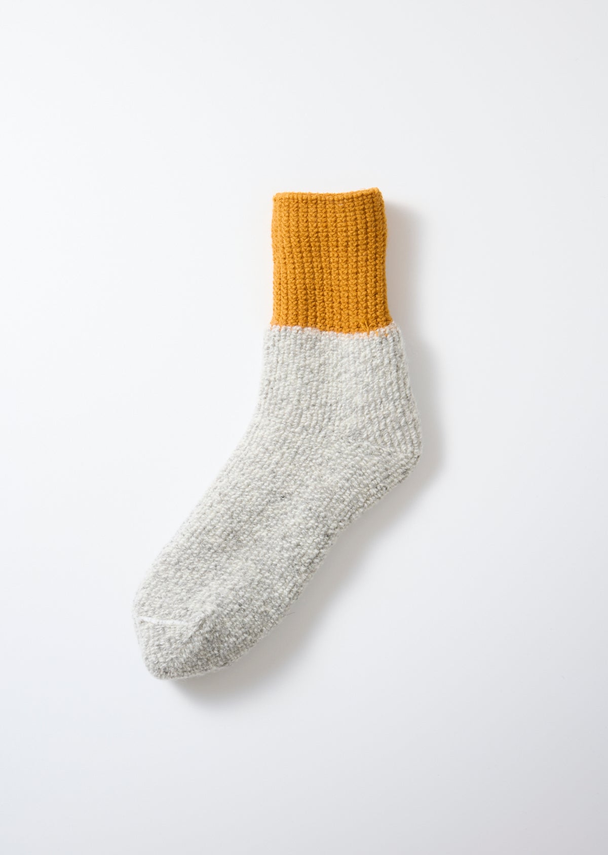 寒冷地で働く漁師や林業従事者のためのワークソックスを編む専用の編み機を使用してつくられたルームソックス。ワークソックスと同じ太番手のウール×アクリル混紡糸をベースに、内側全体を肉厚のパイル編みに仕上げることで、優れた保温性とクッション性を実現しました。足底のプリントは滑り止めグリップとしても機能します。