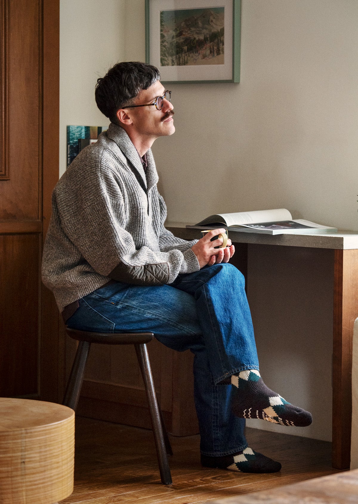 保温性とやさしい肌ざわりが特長の、アクリルとウールの混紡糸を使用したスーパーローゲージのルームソックスです。デザインのインスピレーションは、北欧の伝統的なノルディックセーターから得たもの。ワークソックス用の特殊な編み機で編み立てた後、内側に起毛を施すことで、保温性をさらに高めています。履き口の少し下にはゴムが入っており、折り返しても履ける仕様に。足底のプリントは、デザイン性だけでなく、滑り止めとしての機能も兼ね備えています。
