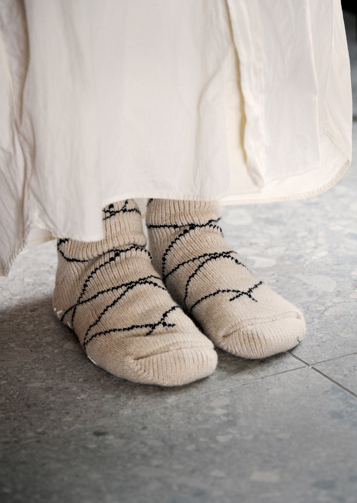 These thick room socks are luxuriously crafted from merino lambswool using a low-gauge knitting machine typically used for making fisherman’s socks. The design is inspired by traditional handwoven rugs known as Beni Ouarain, made by the Berber people of northern Morocco. The fine fibers of the lambswool offer a soft, gentle touch, while the thick pile fabric provides excellent warmth—making these socks a perfect gift for the winter season.
