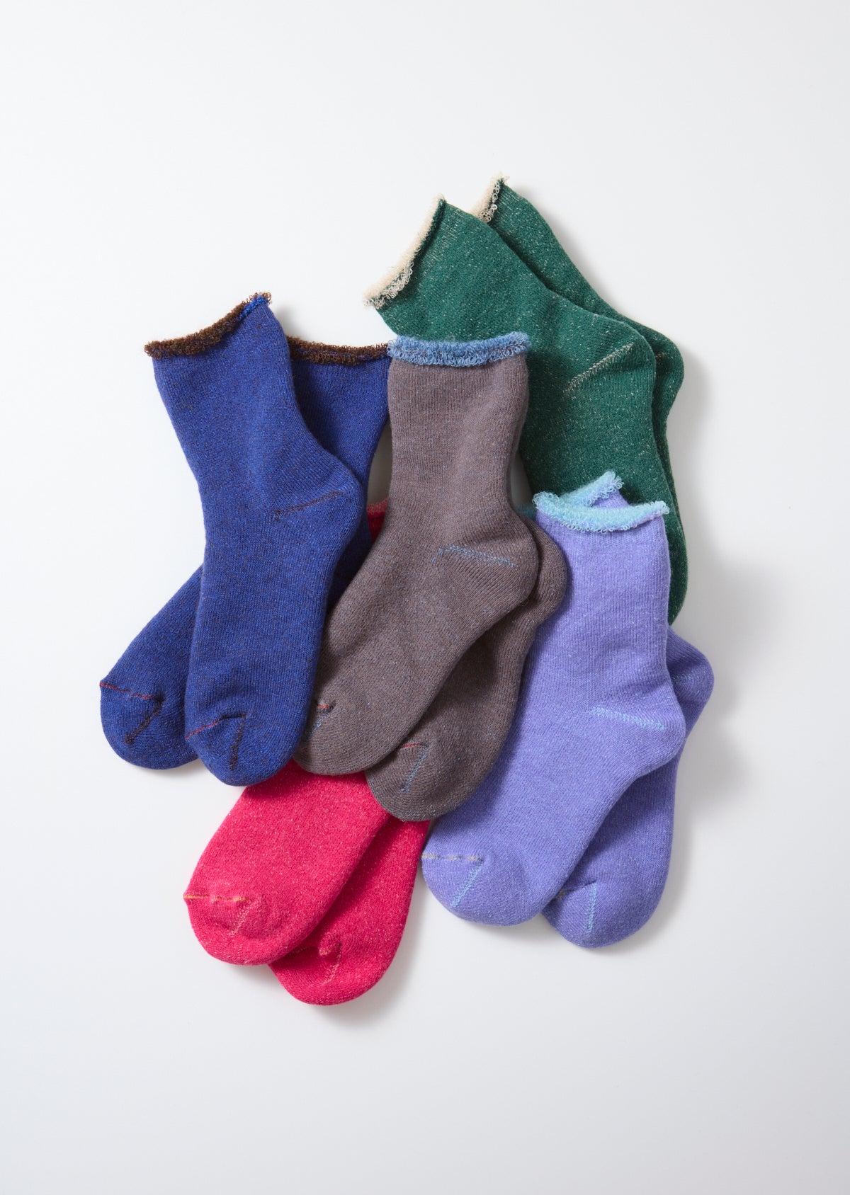 肌にあたる内側にメリノウールを使用し、パイル編みに仕上げたキッズサイズのパイルソックスです。ウールはコットンに比べて保温性と吸放湿性に優れており、冬の寒い日でも元気に走り回る子どもたちの足元を快適に保ちます。また、外側にはコットン糸を使用し、内側のウールを覆うように編み立てることで、耐久性を高めています。