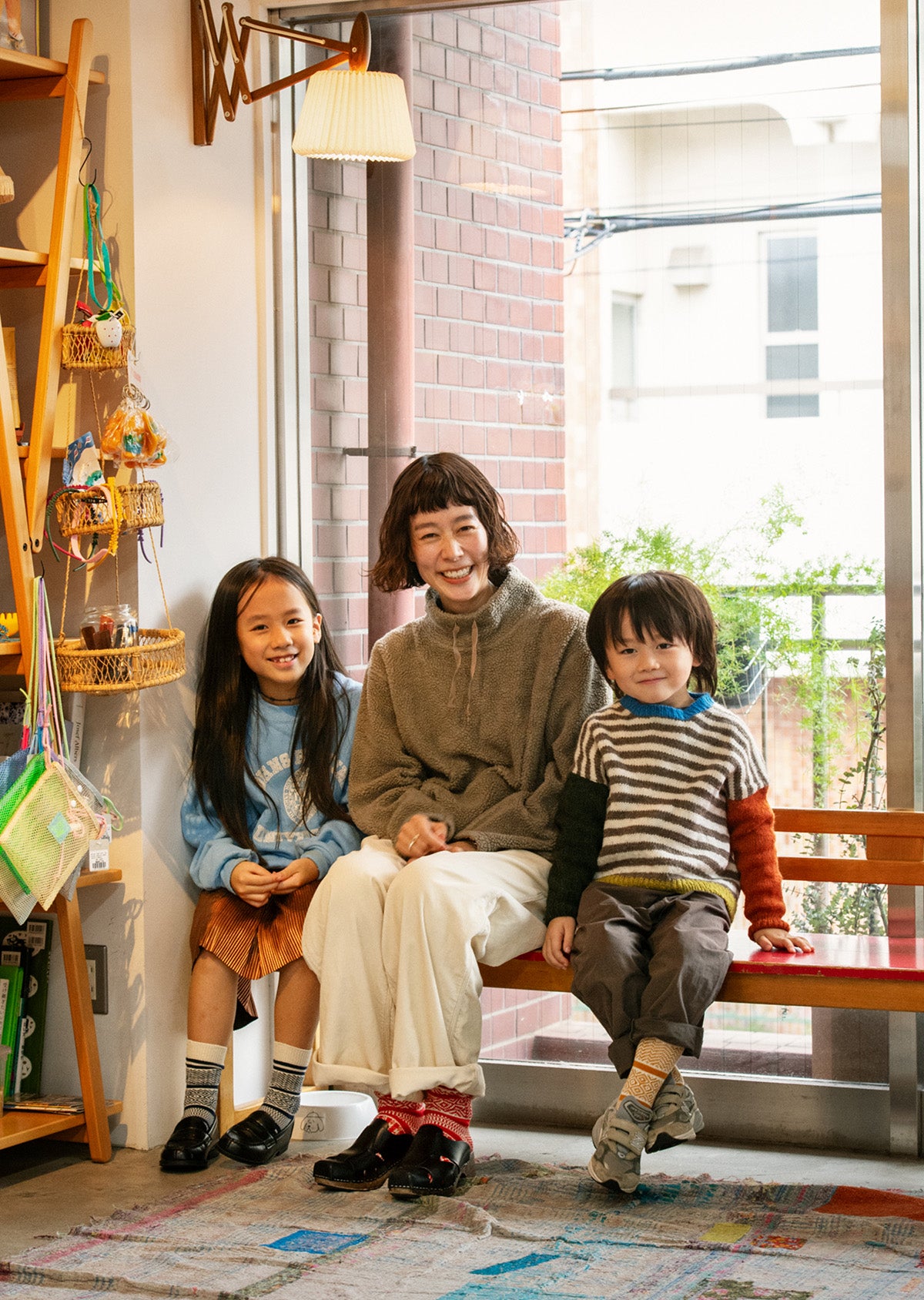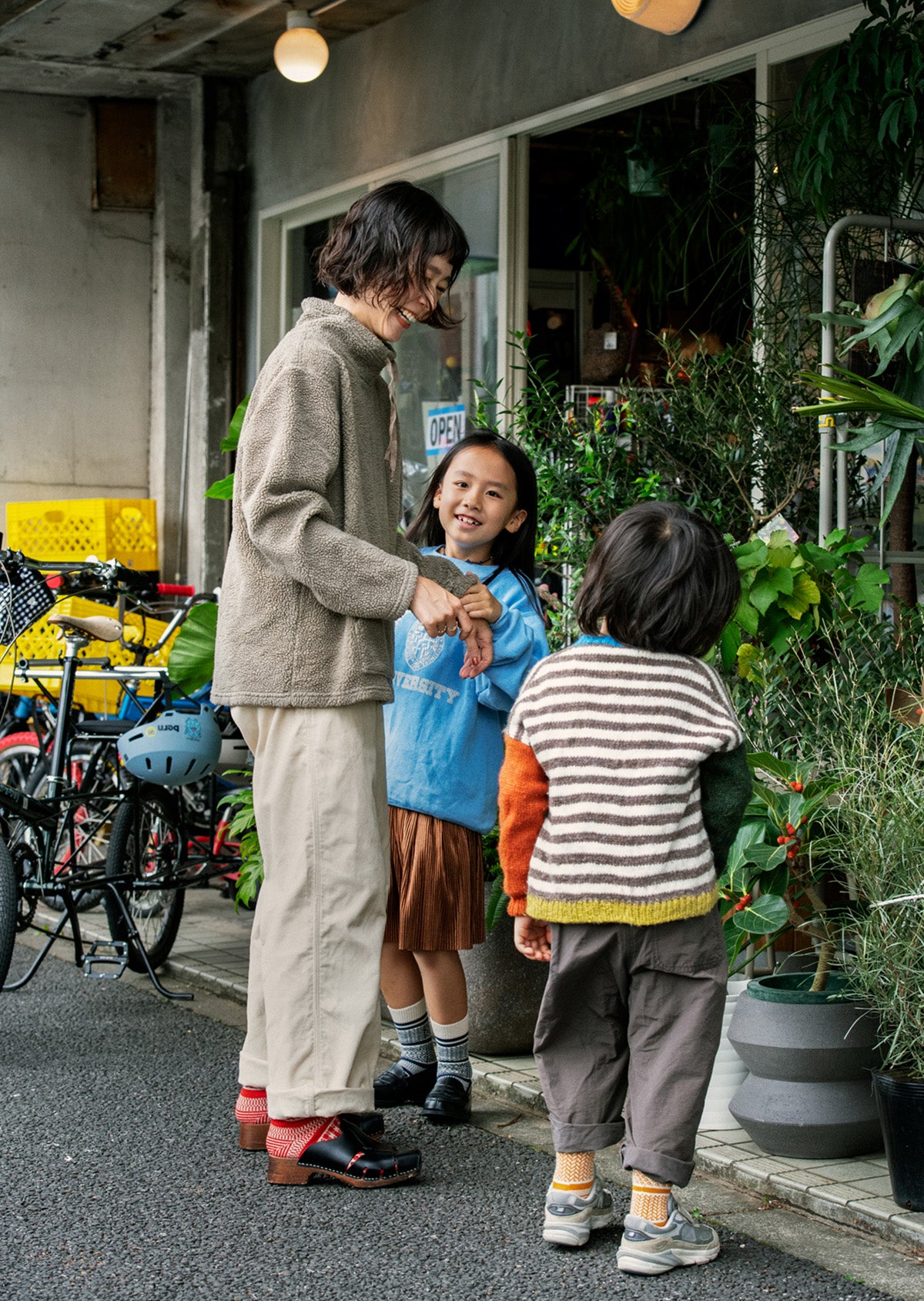 「R1337 MULTI JACQUARD CREW SOCKS」のキッズサイズモデル。裏返すと糸端が出てしまう一般的な柄ソックスとは異なり、内側に糸端が出ないよう丁寧に仕上げたジャカードソックスです。見た目にも履き心地にもこだわった一足。親子でお揃いの柄を楽しめる、リンクコーディネートにもオススメのアイテムです。