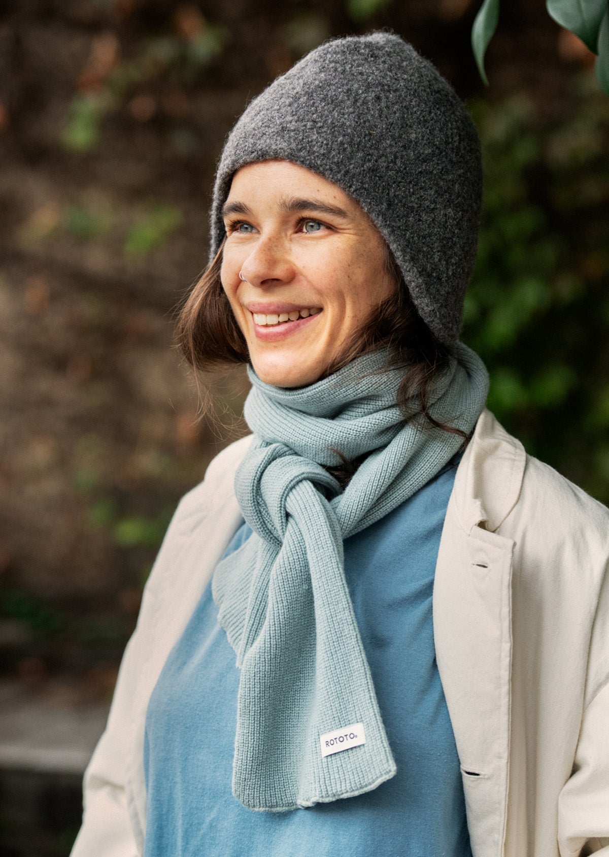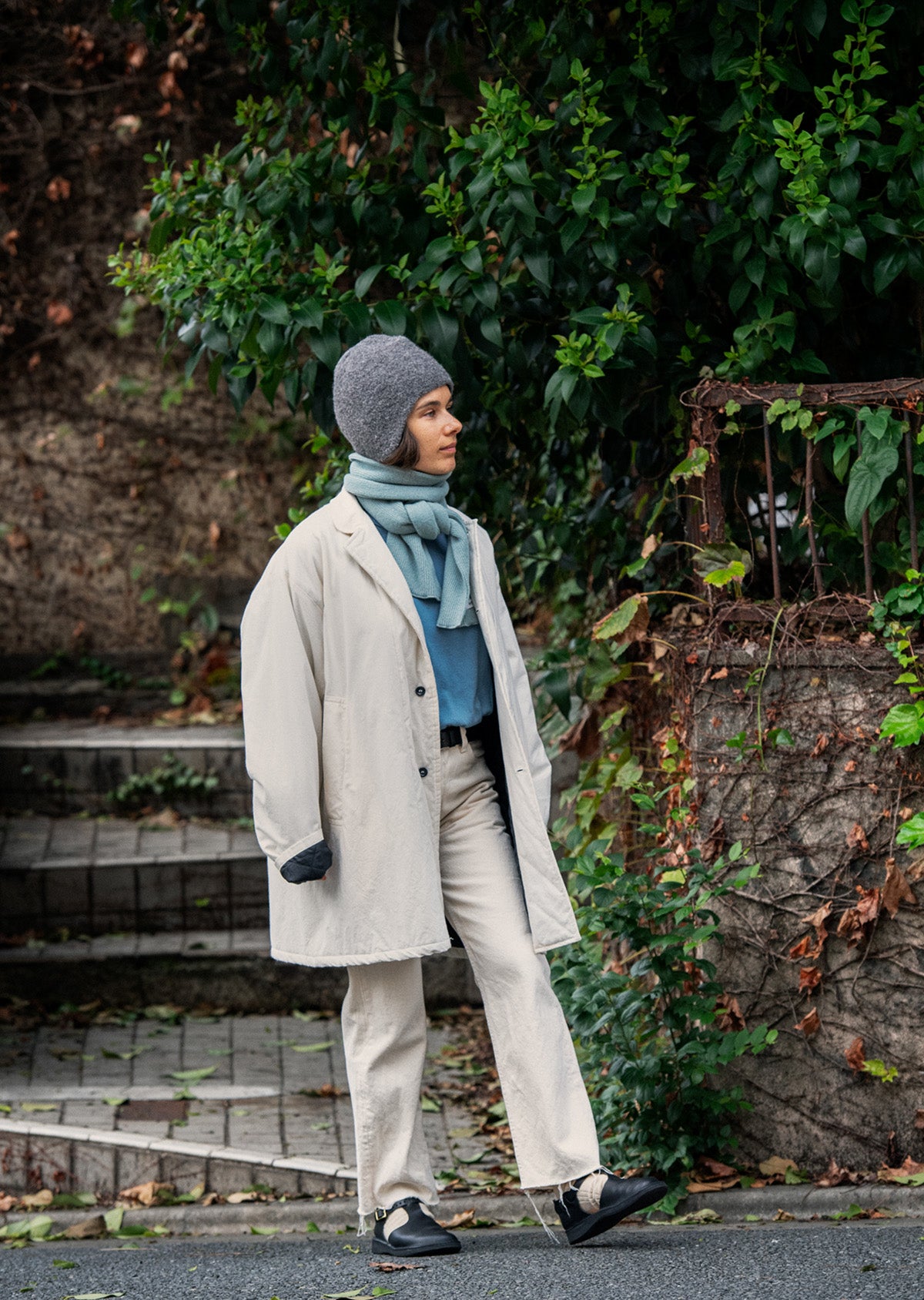 This stole is manufactured with a sock knitting machine with inspiration from military tube scarves. The chunky fabric is densely knitted with resilient, color-developing Australian merino lambs’ wool for extra heat retention around the neck.