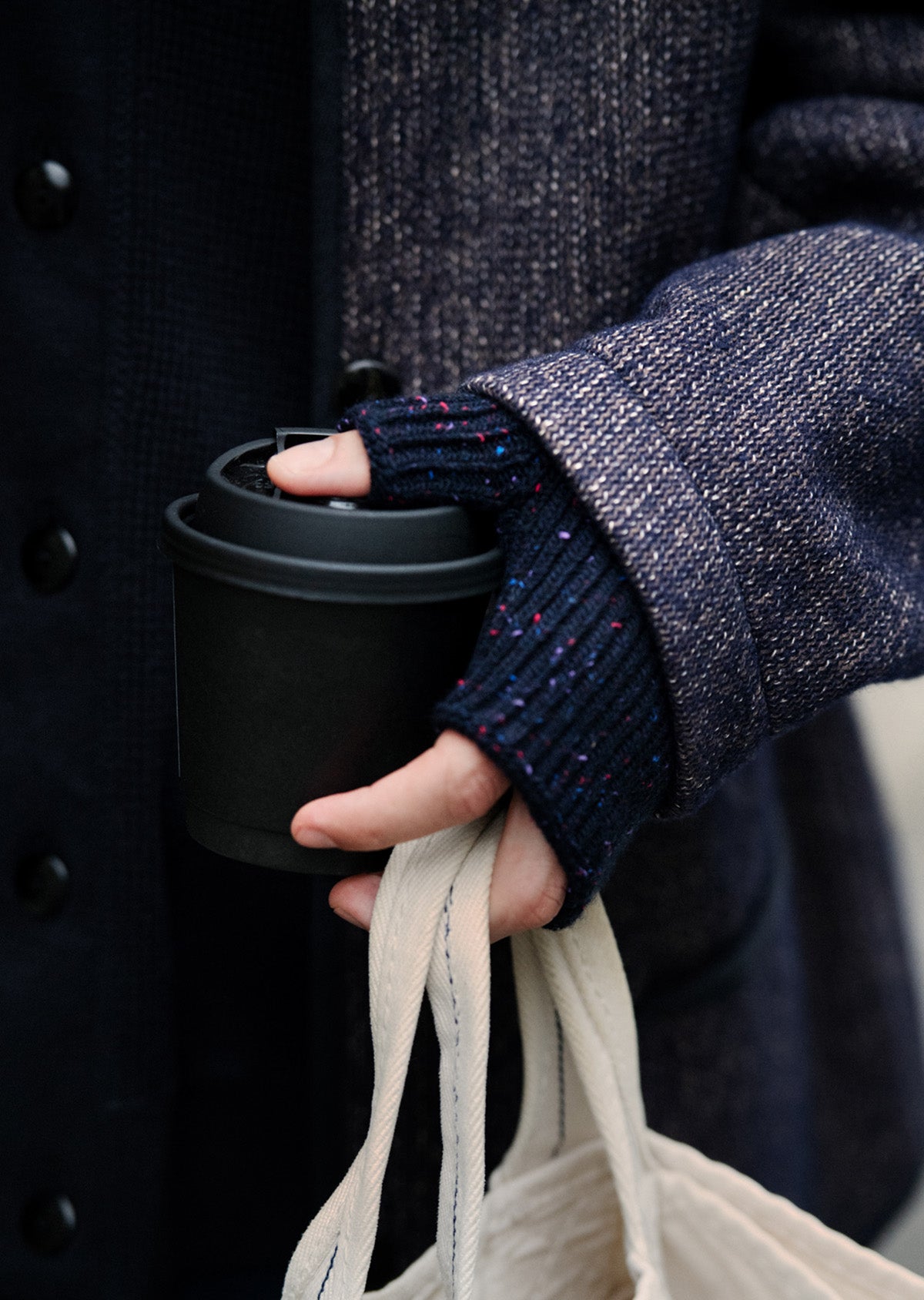 These hand warmers feature colorful nep yarn as a playful accent. They are three-dimensionally knitted using a “WHOLEGARMENT” knitting machine, which requires no sewing or cutting—minimizing material waste. The seamless design ensures a comfortable fit without irritation against the skin. Machine washable for easy care.